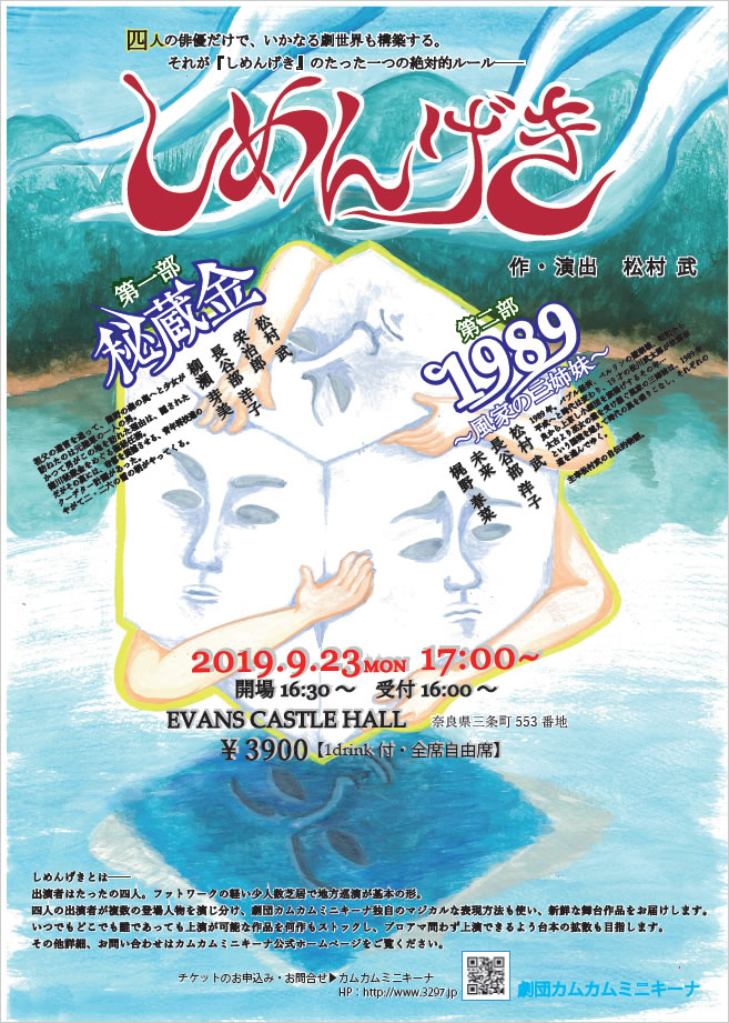 【2019年】 ※画像をクリックすると拡大してご覧いただけます。 2019年9月23日(月・祝)@EVANS CASTLE HALL奈良県奈良市三条町553番地 二作品1ステージ上演。 『秘蔵金』作・演出:松村武出演:松村武、栄治郎、長谷部洋子、柳瀬芽美 『1989~風家の三姉妹~』作・演出:松村武出演:松村武、長谷部洋子、未来、梶野春菜 ※画像をクリックすると拡大してご覧いただけます。